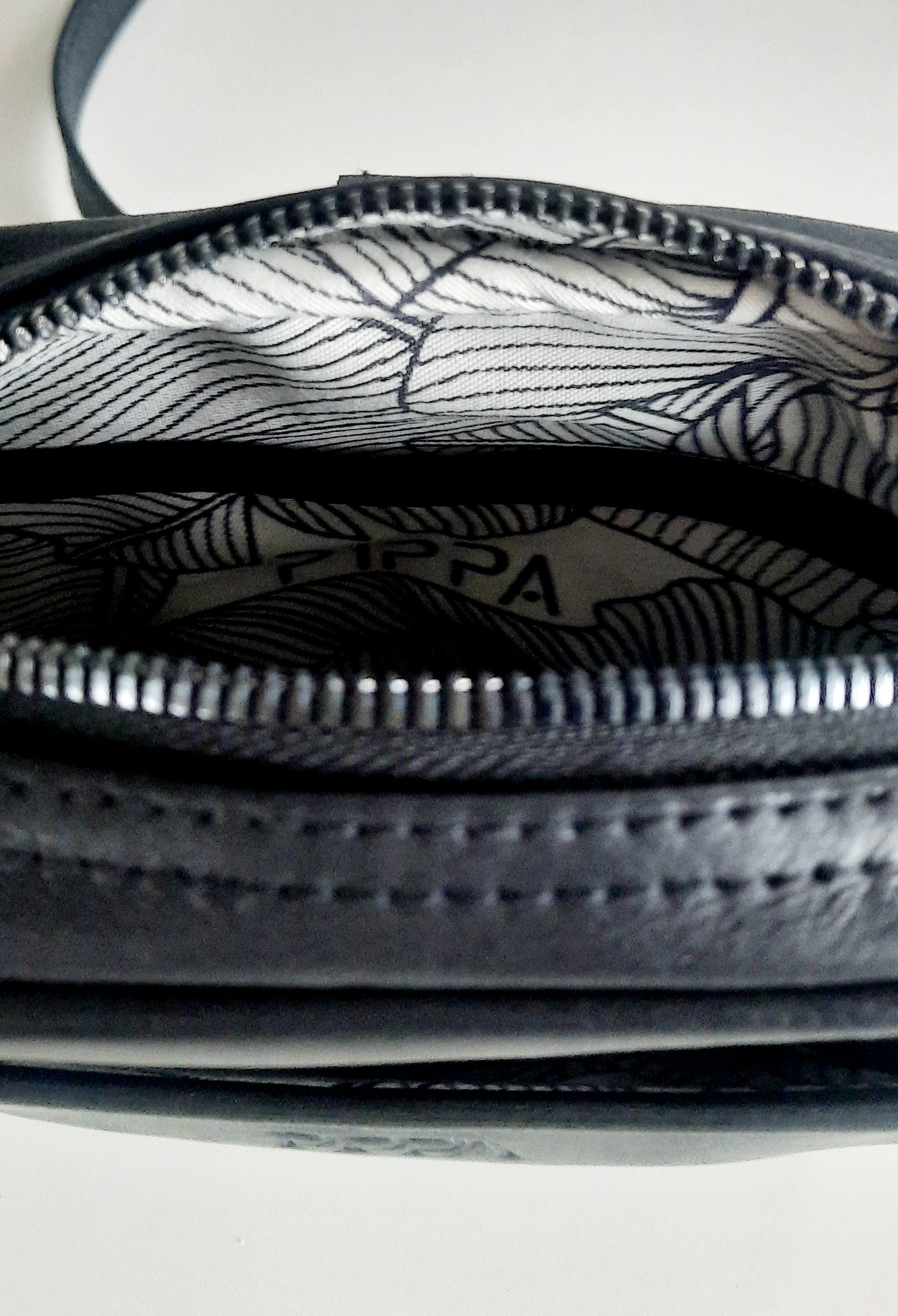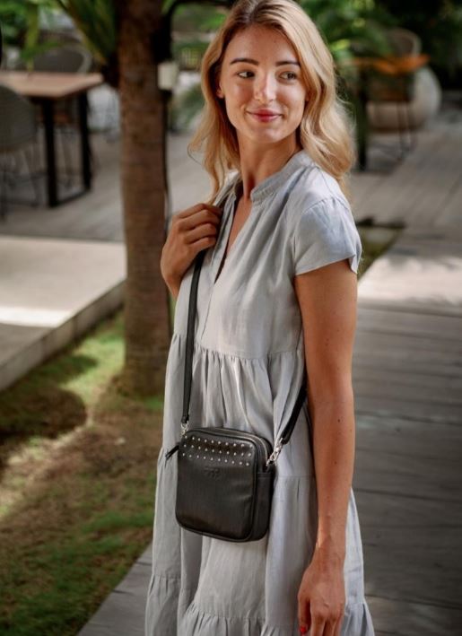 Cute and compact square shaped cross body bag with the extra fun of studs on the front panel.