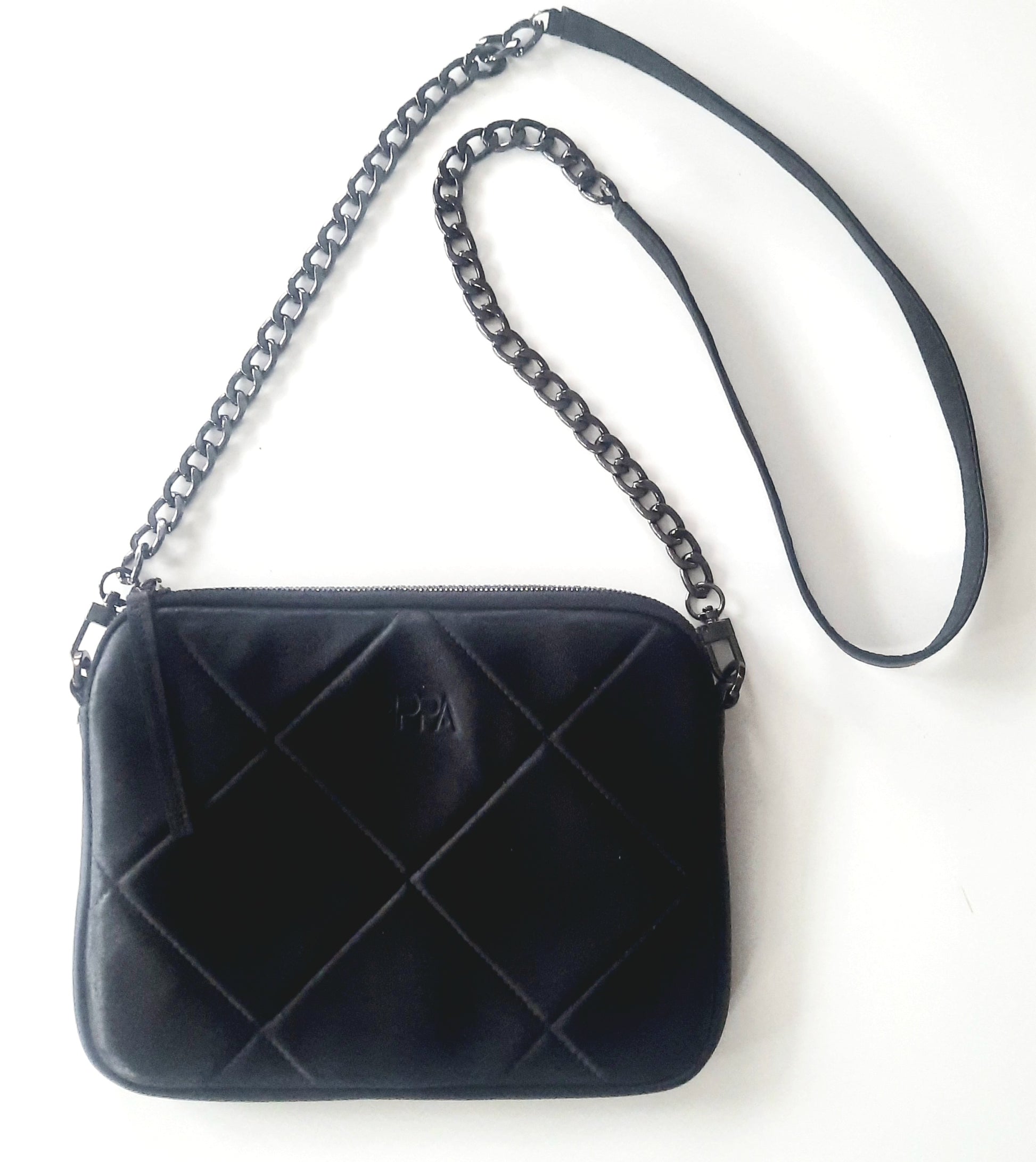 Our classic popular City Bag but with a cross stitch padded exterior on one side. With a black nickel half chain strap this bag has a more dressy vibe.