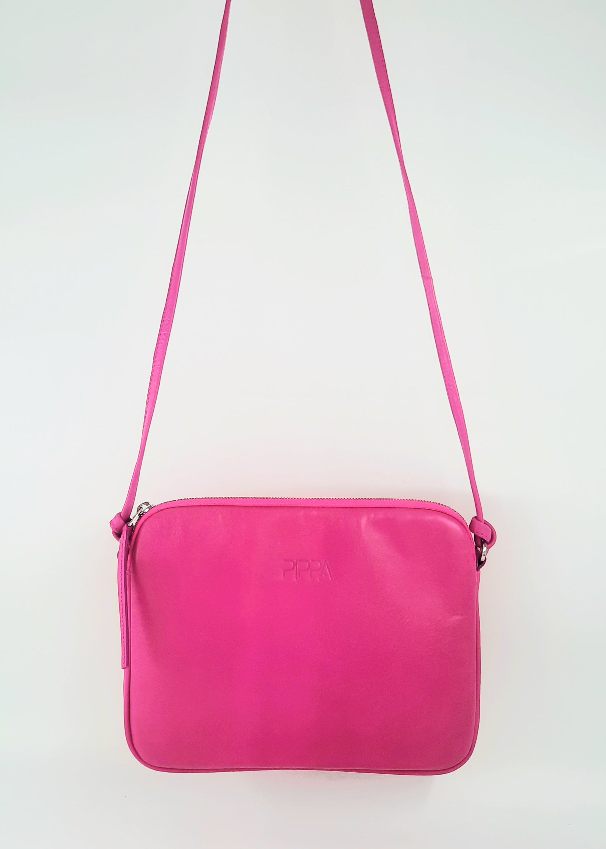 Sporty cross body bag with an adjustable, removable black/white webbing strap. Silver nickel hardware with a zip top closure and internal pocket.