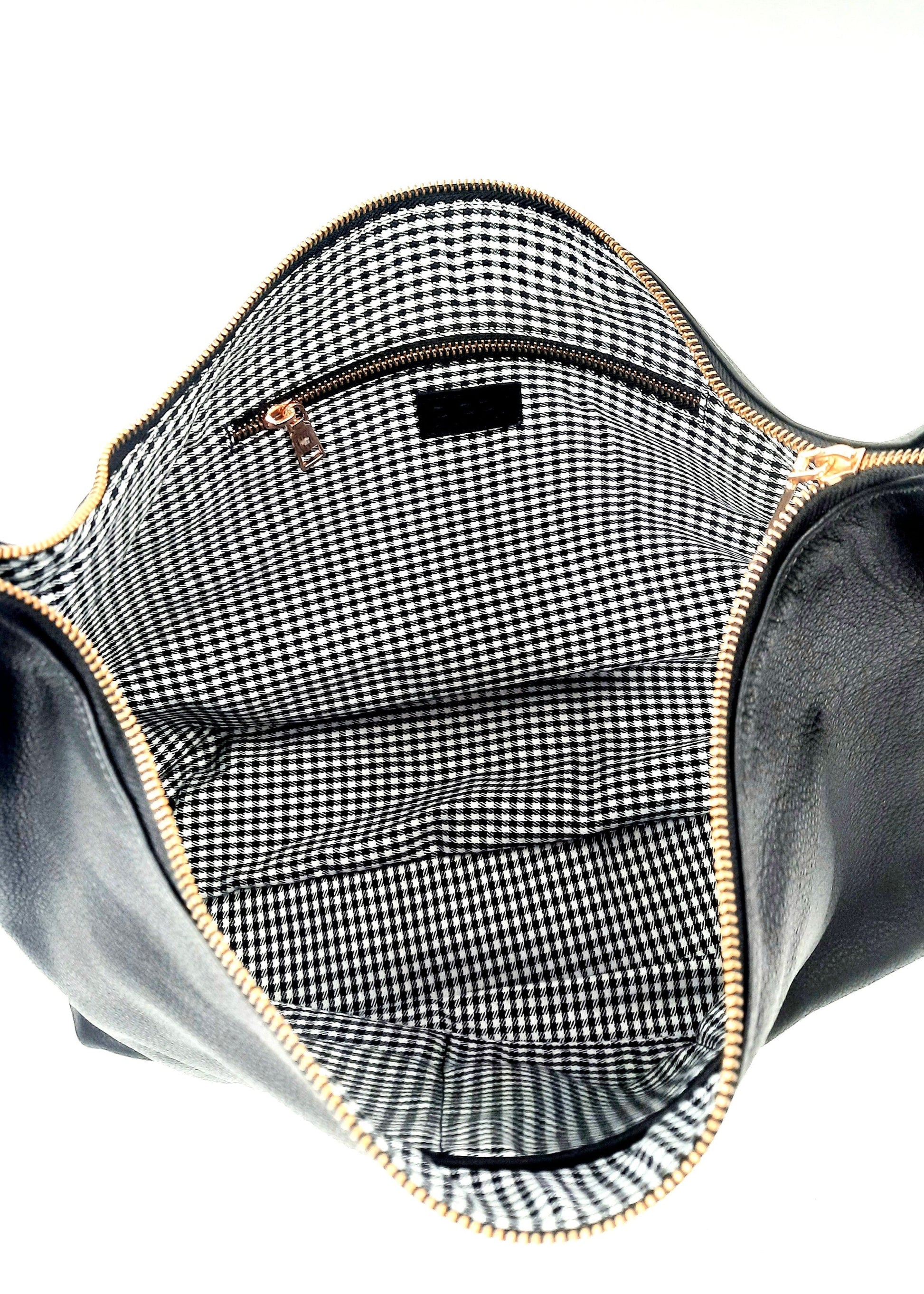 This generously sized bag is handmade in genuine pebbled cowhide with an adjustable dome shoulder strap and an exterior zip pocket.